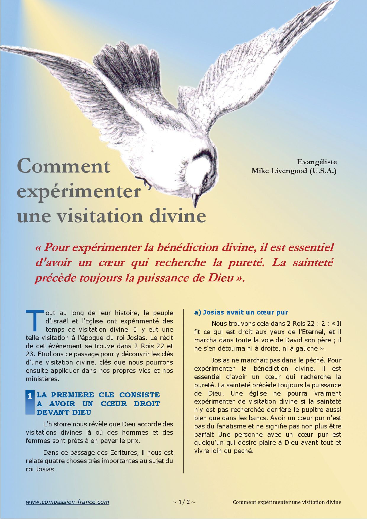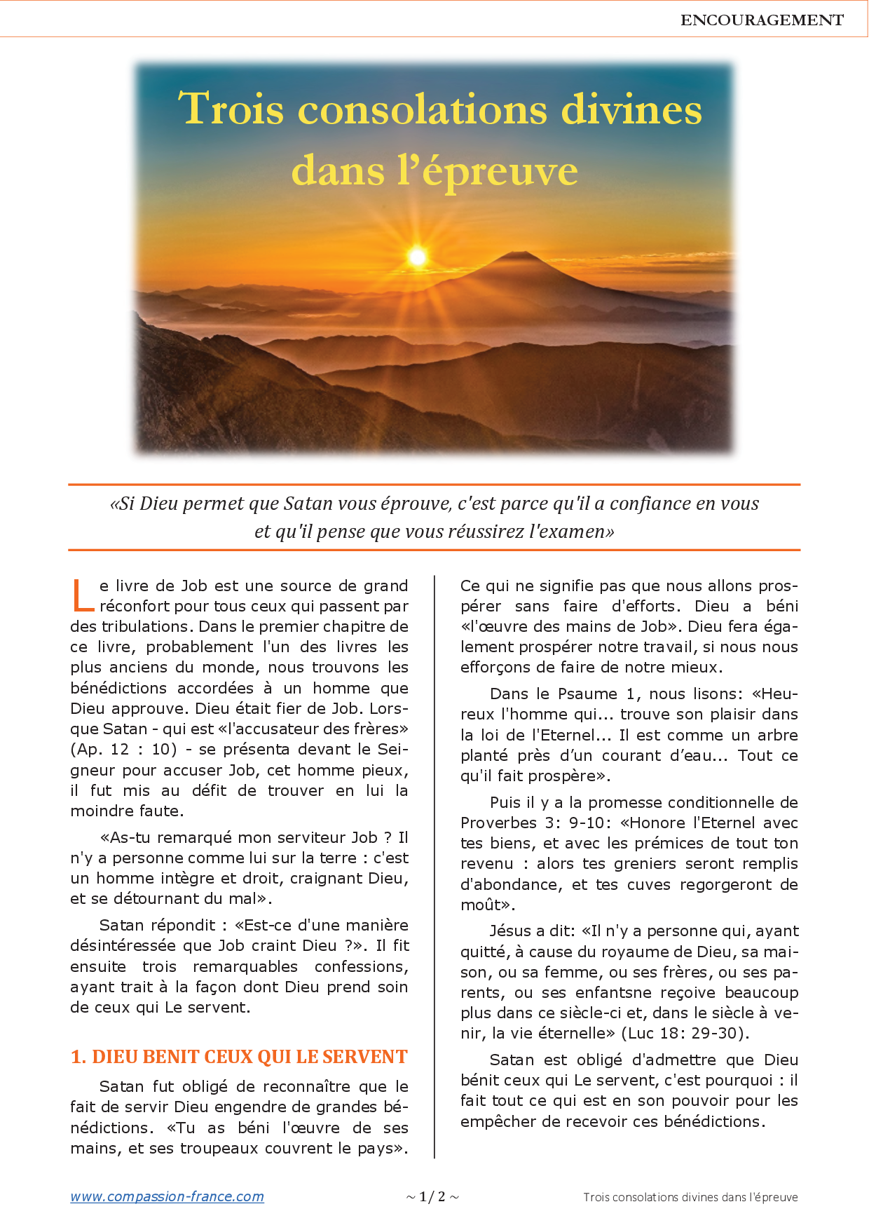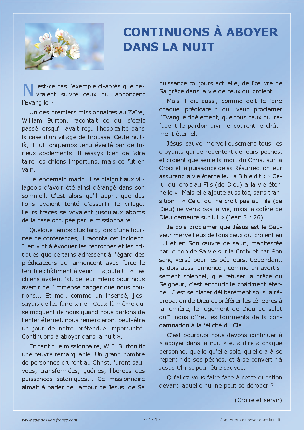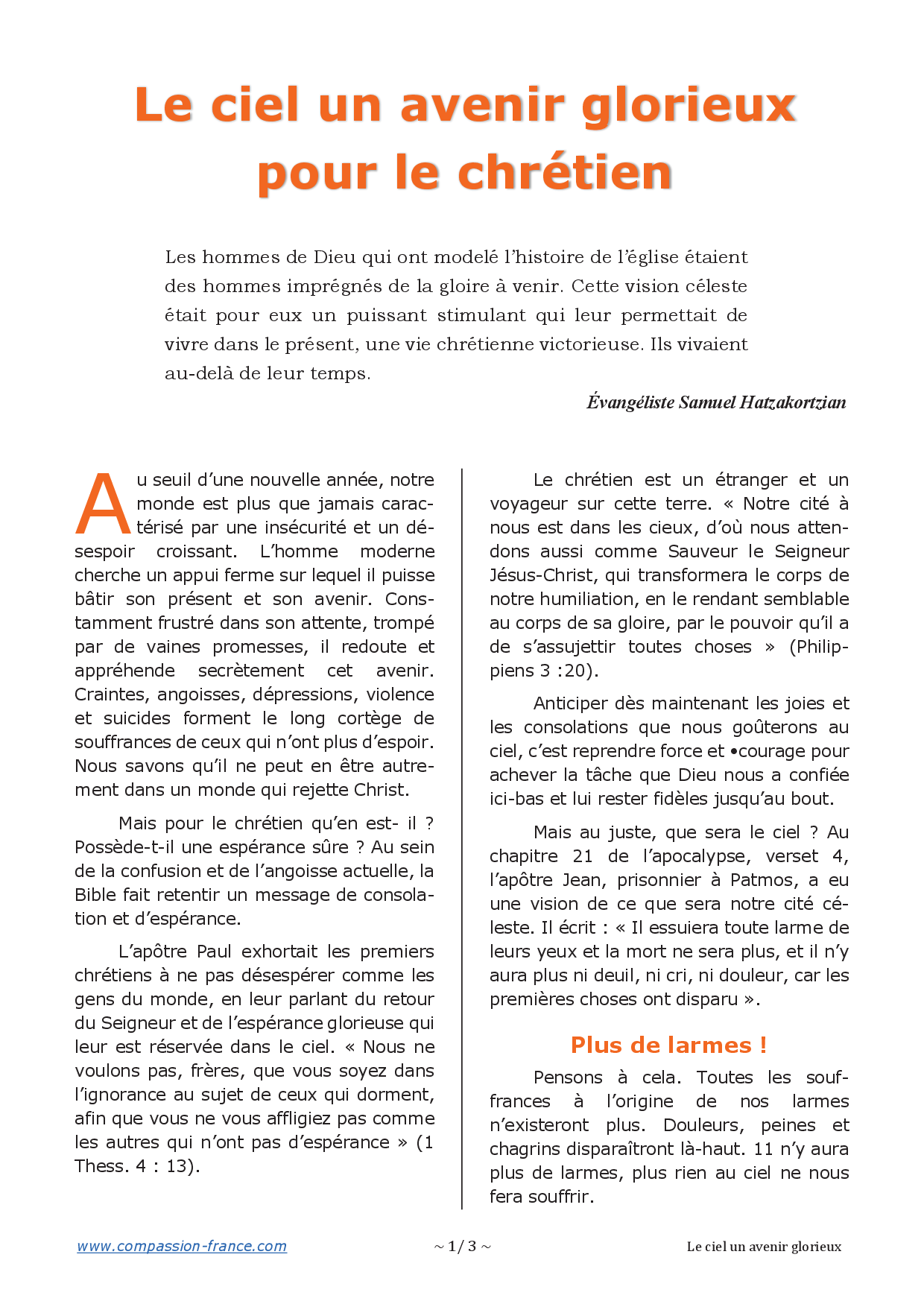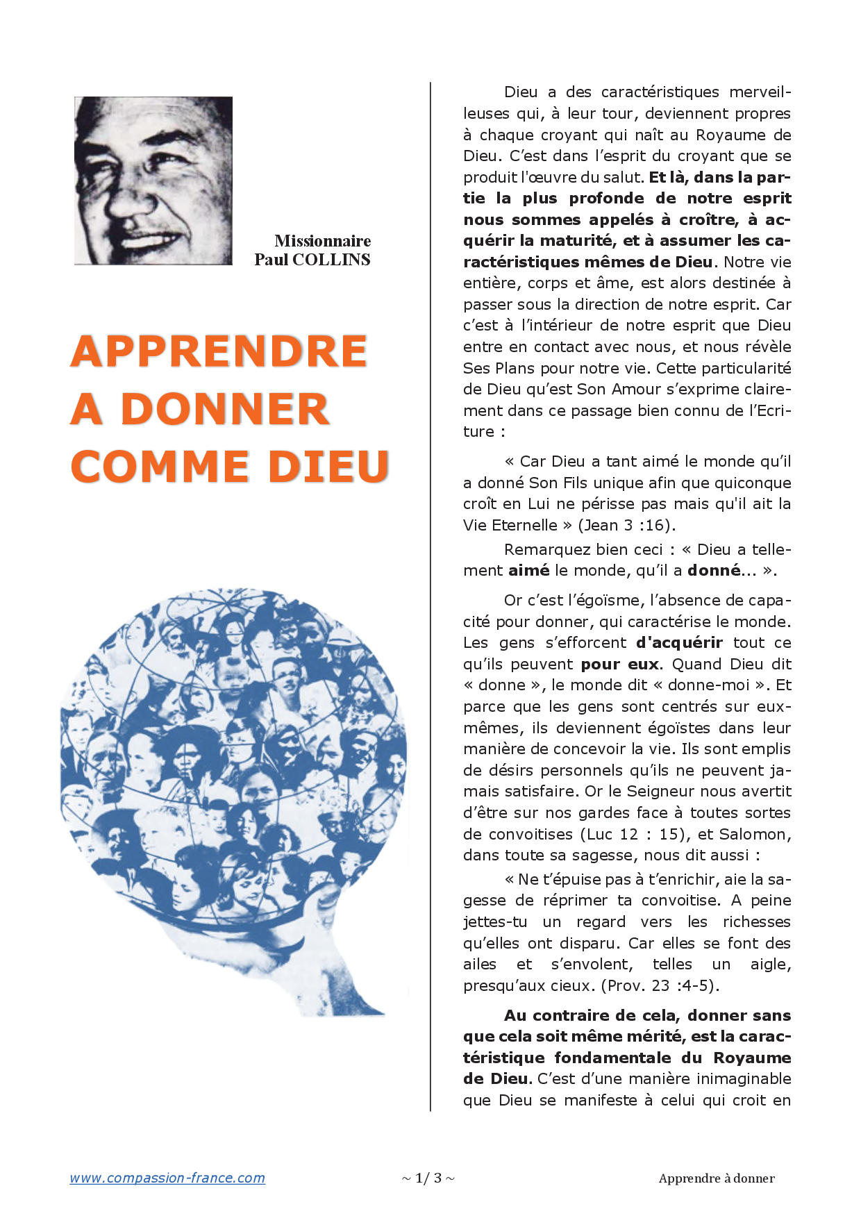 Nous avons ici le plaisir de mettre à votre disposition des messages, sermons et études bibliques de serviteurs de Dieu de nombreux pays, extraits de notre magazine Compassion, diffusé pendant 20 ans dans le monde. Tous ces articles vous seront d’une grande bénédiction pour votre vie personnelle et également une source d’inspiration précieuse pour le ministère.