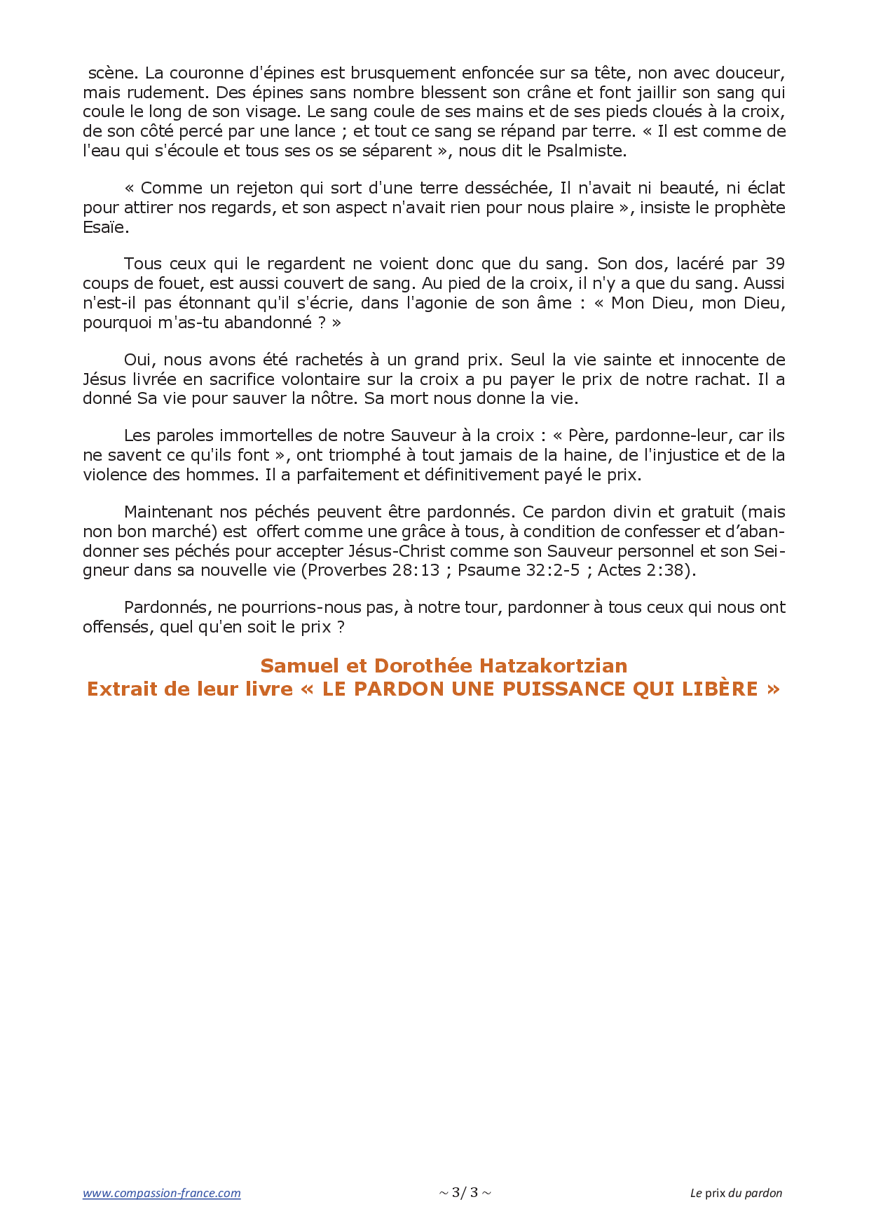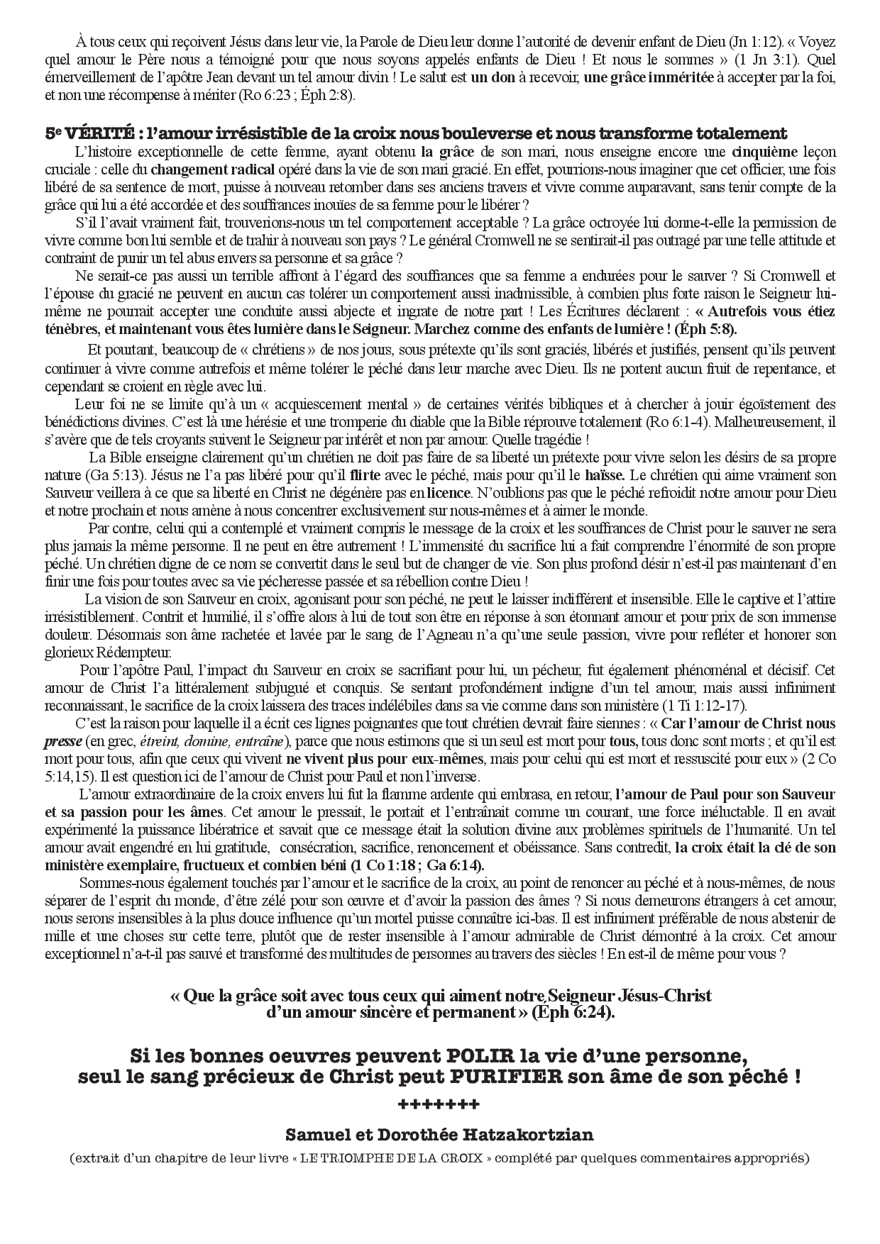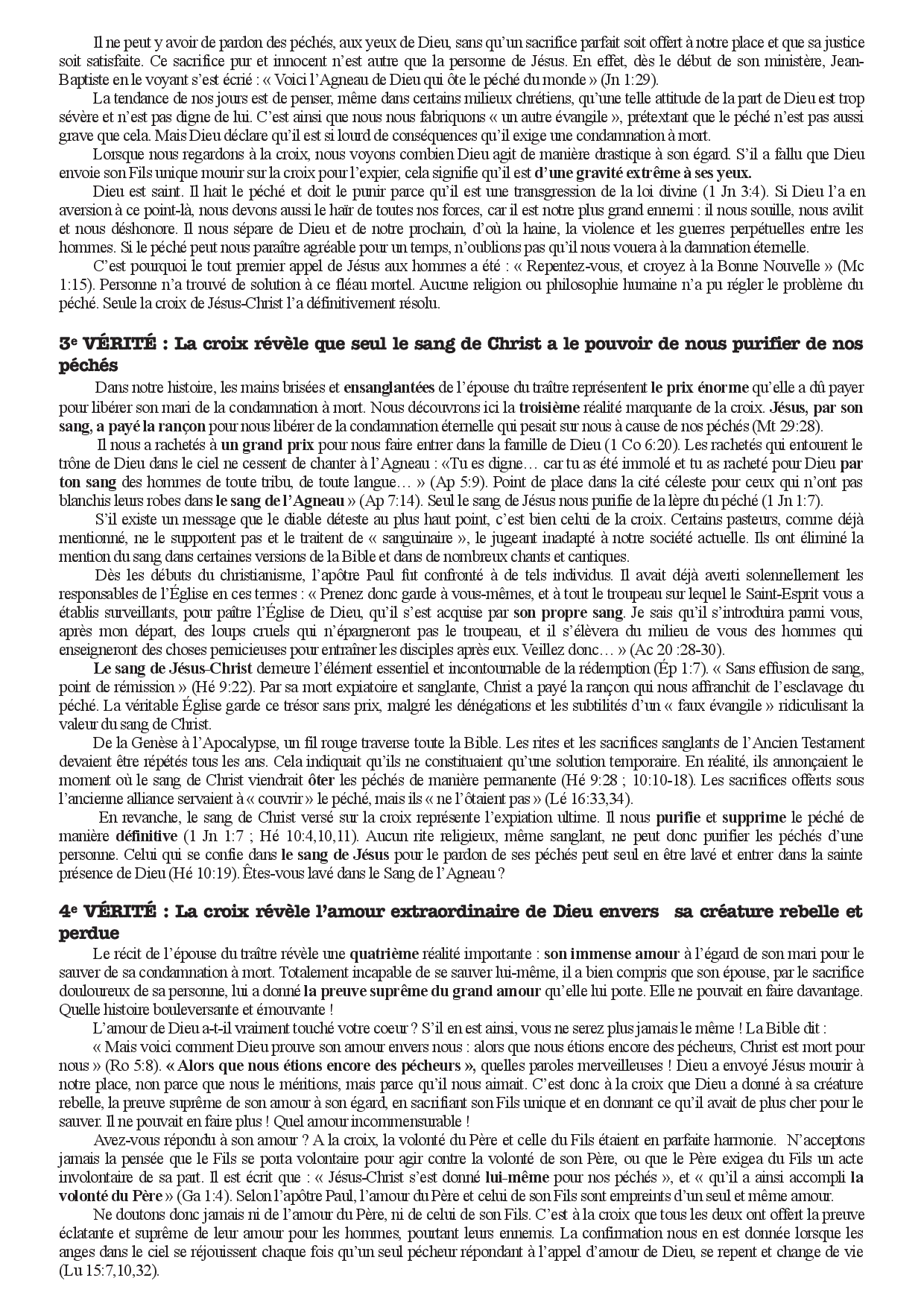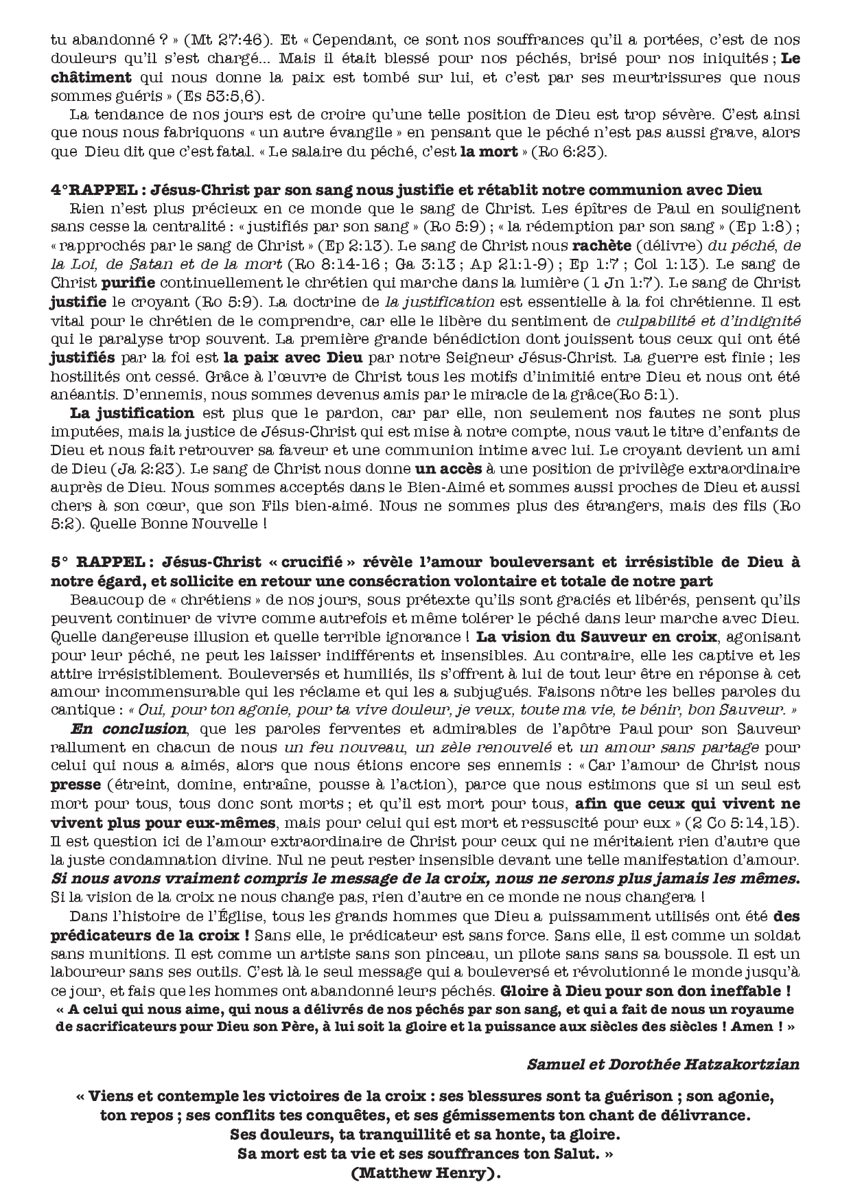 Devant l'œuvre libératrice grandiose qui a été accomplie à la croix, nous ne pouvons que nous prosterner et adorer l'Agneau qui a été immolé et qui est assis sur le trône, en nous écriant de tout notre être : « A celui qui nous aime, qui nous a délivrés de nos péchés par son sang, et qui a fait de nous un royaume, des sacrificateurs pour Dieu son Père, à lui soient la gloire et la puissance aux siècles des siècles ! Amen ! » (Ap 1:5,6).
