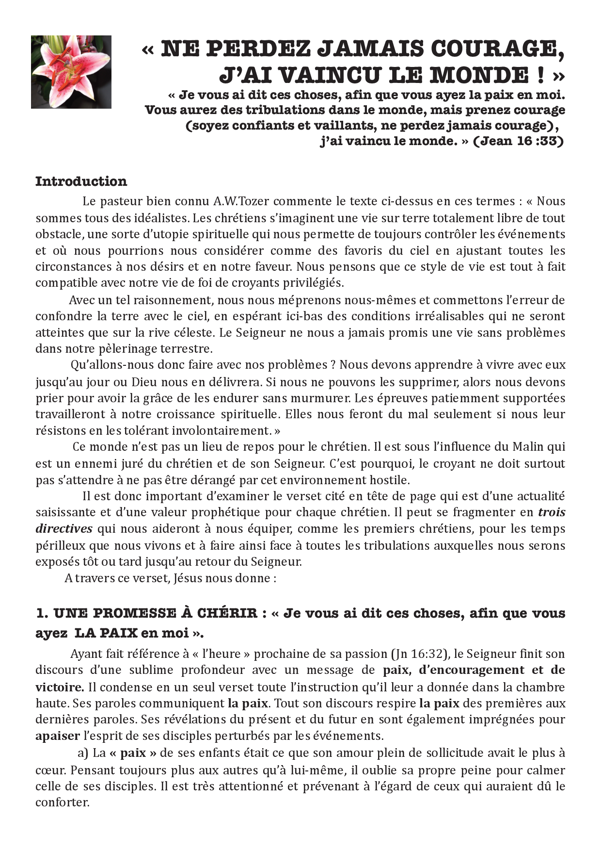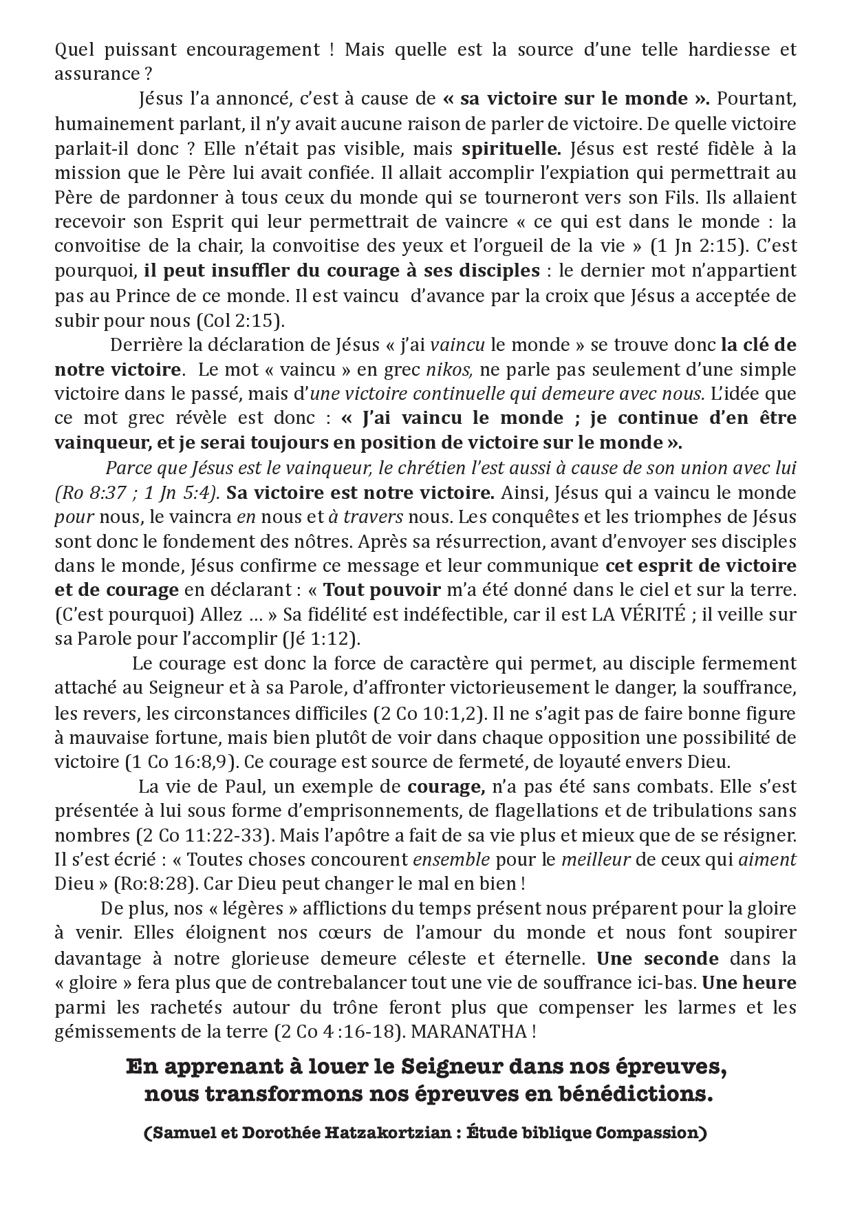 Le combat spirituel est certes réel, mais il est bon de se rappeler sans cesse, que le combat définitif contre Satan a déjà été remporté à la croix. Maintenant, ce Christ victorieux vit en nous ! C'est pourquoi l'apôtre Jean nous déclare avec force : « Celui qui est en vous est plus grand que celui qui est dans le monde » (1 Jn 4:4).