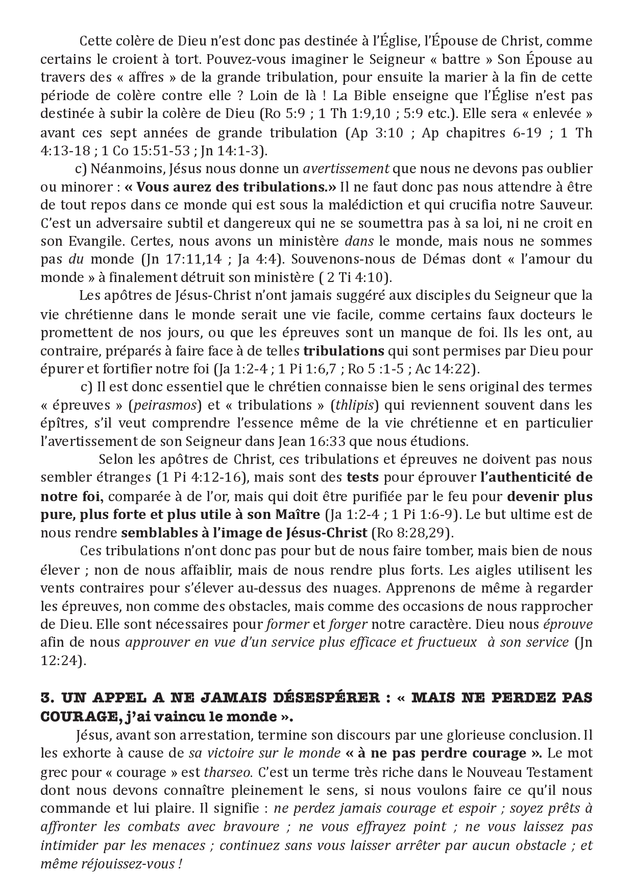 Certains contradicteurs récriminent ce retour en deux étapes en disant : « Montrez-nous, dans le Nouveau Testament, un passage où il est clairement parlé de ces deux événements ». A cela, on peut leur rétorquer : « Montrez-nous, dans l'Ancien Testament, l'endroit où il est clairement annoncé qu'il y aurait deux venues du Messie ». Cela n'est naturellement pas dit explicitement et, pourtant, la réponse est évidente. Chacun sait pertinemment que la venue du Messie, selon le plan de Dieu dans les Écritures, doit se faire en deux étapes : une première fois pour mourir et la seconde pour régner. Il est d'abord venu en tant qu'Agneau ôtant le péché du monde, mais il reviendra un jour comme Roi pour régner. Il est absolument impossible de fondre en un seul événement tout ce que l'Ancien Testament a prédit à propos de la venue du Messie. N'est-ce pas justement pour avoir voulu faire un tel amalgame que, en Israël du temps de Jésus, des multitudes ont rejeté le Messie comme Sauveur ?