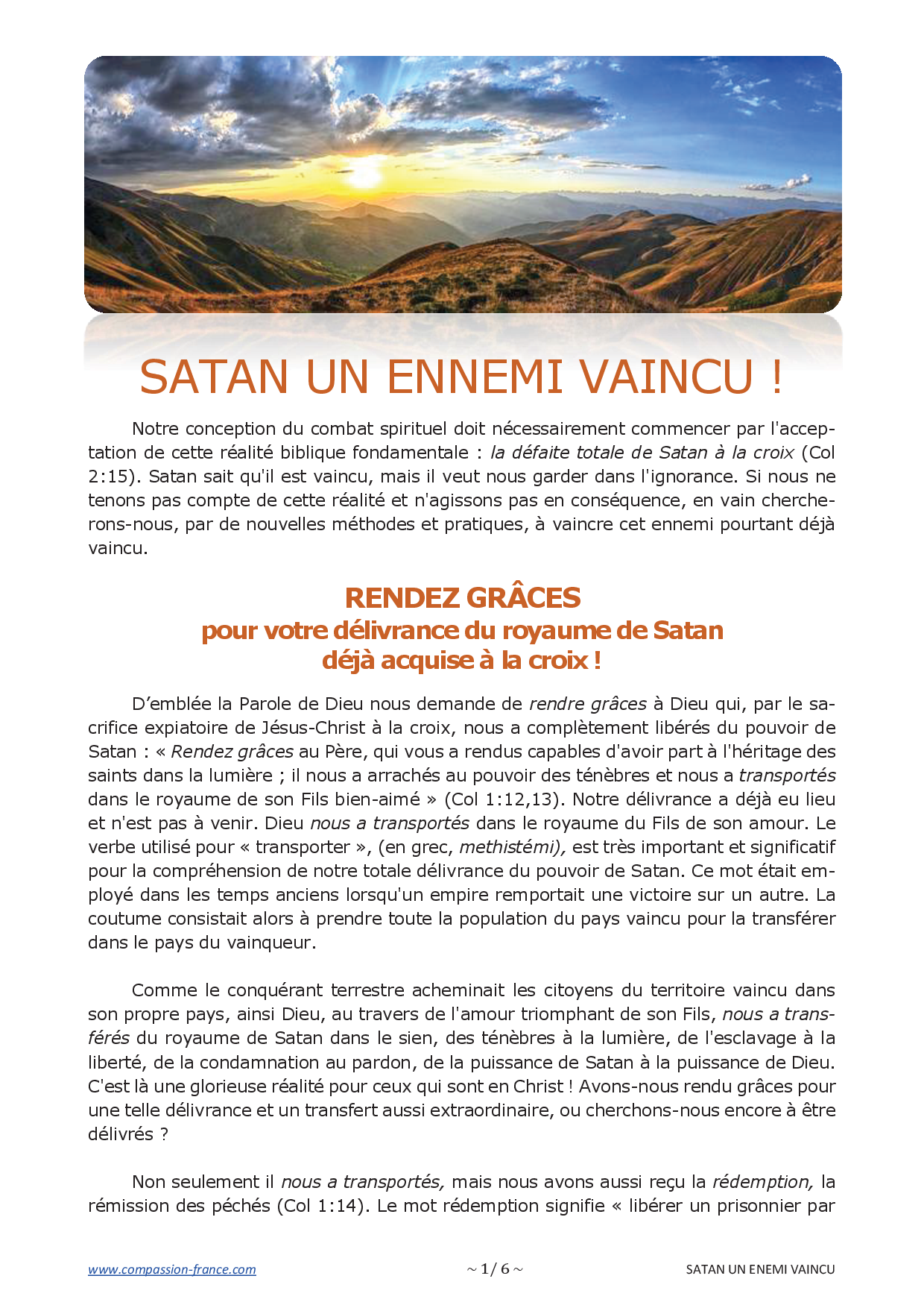 D’emblée la Parole de Dieu nous demande de rendre grâces à Dieu qui, par le sacrifice expiatoire de Jésus-Christ à la croix, nous a complètement libérés du pouvoir de Satan : « Rendez grâces au Père, qui vous a rendus capables d'avoir part à l'héritage des saints dans la lumière ; il nous a arrachés au pouvoir des ténèbres et nous a transportés dans le royaume de son Fils bien-aimé » (Col 1:12,13). Notre délivrance a déjà eu lieu et n'est pas à venir. Dieu nous a transportés dans le royaume du Fils de son amour. Le verbe utilisé pour « transporter », (en grec, methistémi), est très important et significatif pour la compréhension de notre totale délivrance du pouvoir de Satan. Ce mot était employé dans les temps anciens lorsqu'un empire remportait une victoire sur un autre. La coutume consistait alors à prendre toute la population du pays vaincu pour la transférer dans le pays du vainqueur.