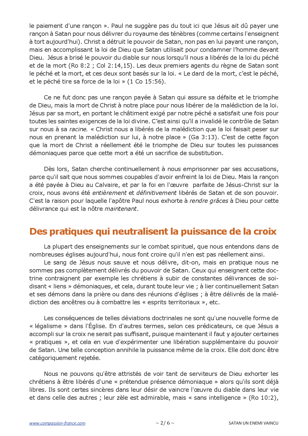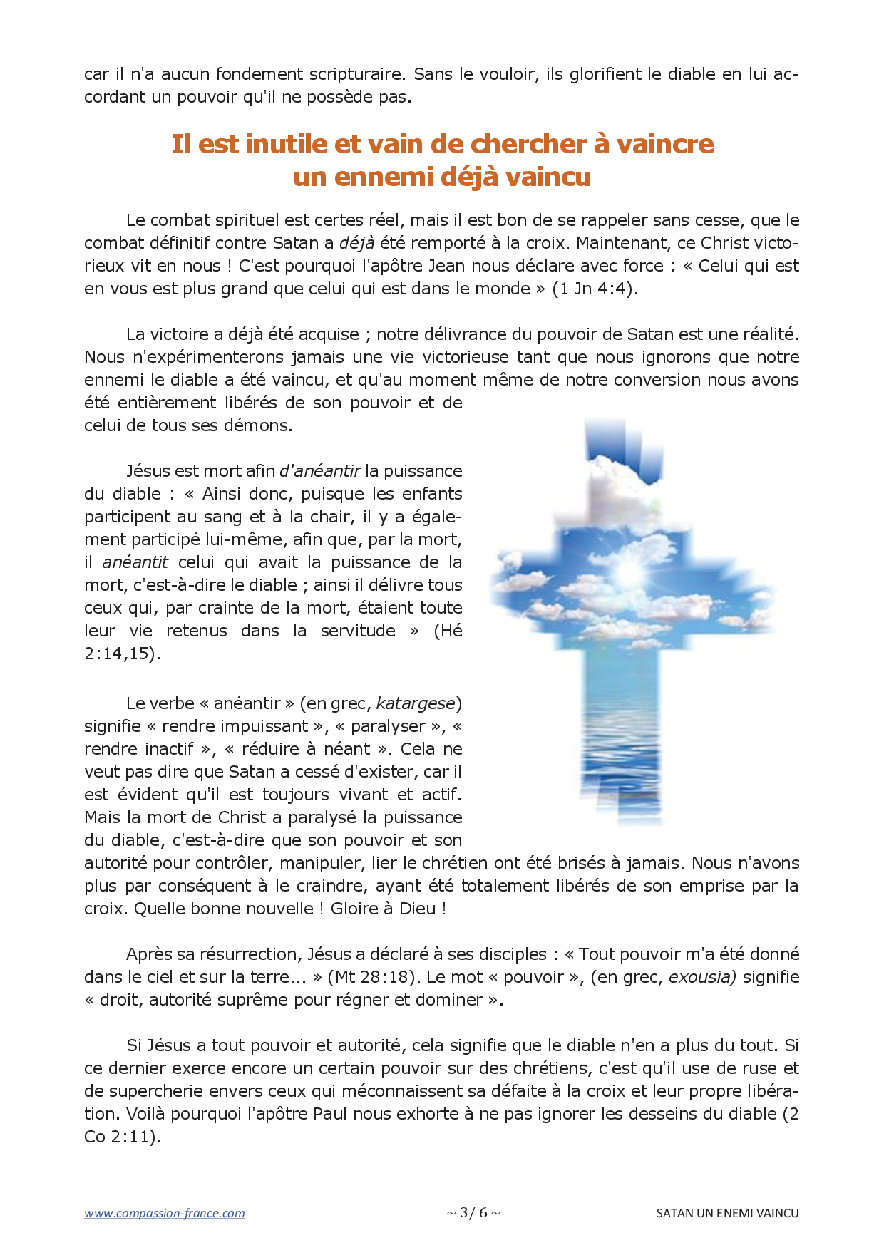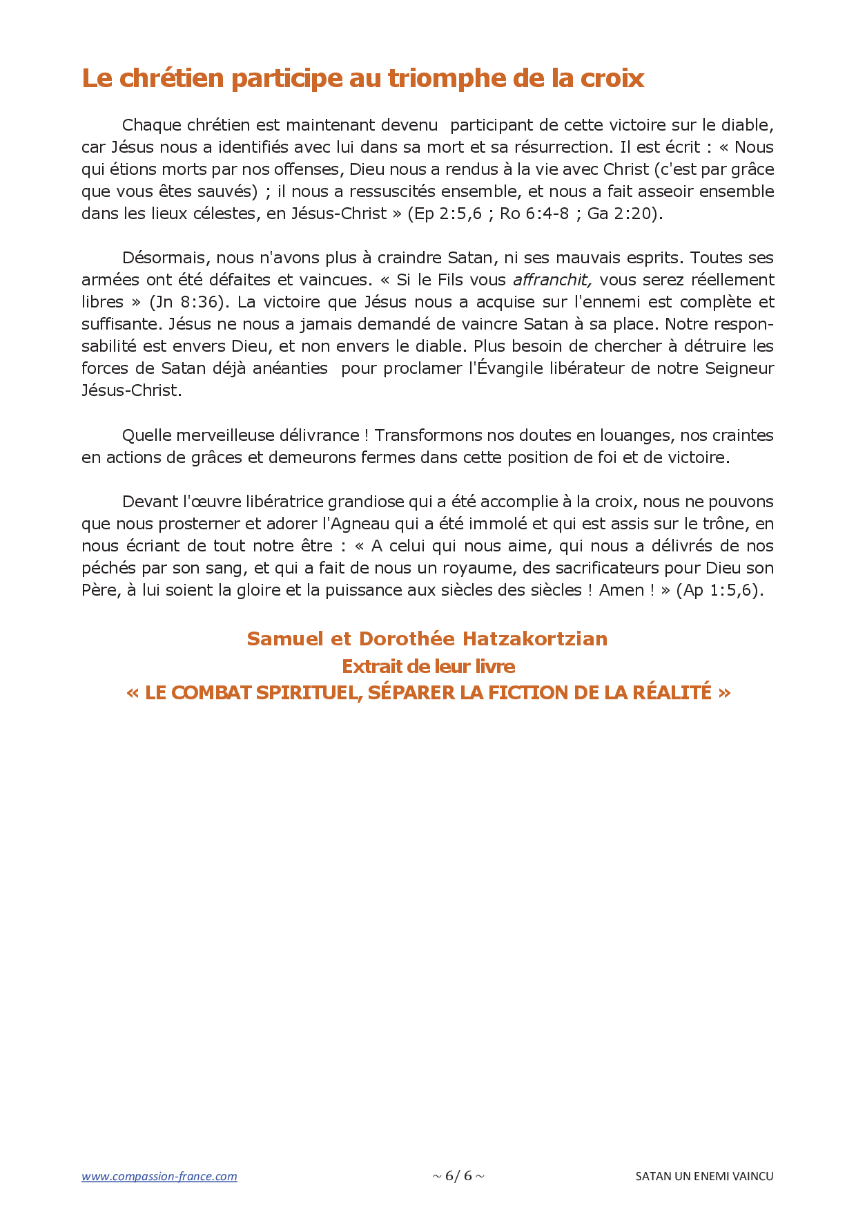 Notre conception du combat spirituel doit nécessairement commencer par l'acceptation de cette réalité biblique fondamentale : la défaite totale de Satan à la croix (Col 2:15). Satan sait qu'il est vaincu, mais il veut nous garder dans l'ignorance. Si nous ne tenons pas compte de cette réalité et n'agissons pas en conséquence, en vain chercherons-nous, par de nouvelles méthodes et pratiques, à vaincre cet ennemi pourtant déjà vaincu.