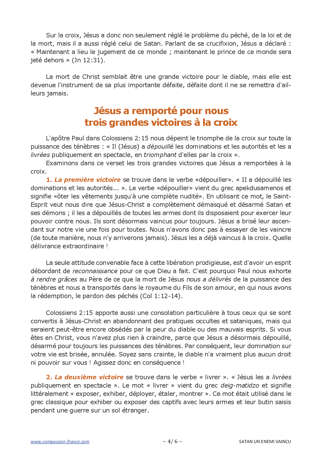 1. La première victoire se trouve dans le verbe «dépouiller». « II a dépouillé les dominations et les autorités... ». Le verbe «dépouiller» vient du grec apekdusamenos et signifie «ôter les vêtements jusqu'à une complète nudité». En utilisant ce mot, le Saint-Esprit veut nous dire que Jésus-Christ a complètement démasqué et désarmé Satan et ses démons ; il les a dépouillés de toutes les armes dont ils disposaient pour exercer leur pouvoir contre nous. Ils sont désormais vaincus pour toujours. Jésus a brisé leur ascendant sur notre vie une fois pour toutes. Nous n'avons donc pas à essayer de les vaincre (de toute manière, nous n'y arriverons jamais). Jésus les a déjà vaincus à la croix. Quelle délivrance extraordinaire !