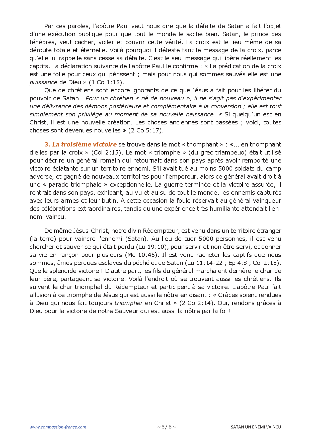 3. La troisième victoire se trouve dans le mot « triomphant » : «... en triomphant d'elles par la croix » (Col 2:15). Le mot « triomphe » (du grec triambeuo) était utilisé pour décrire un général romain qui retournait dans son pays après avoir remporté une victoire éclatante sur un territoire ennemi. S'il avait tué au moins 5000 soldats du camp adverse, et gagné de nouveaux territoires pour l'empereur, alors ce général avait droit à une « parade triomphale » exceptionnelle. La guerre terminée et la victoire assurée, il rentrait dans son pays, exhibant, au vu et au su de tout le monde, les ennemis capturés avec leurs armes et leur butin. A cette occasion la foule réservait au général vainqueur des célébrations extraordinaires, tandis qu'une expérience très humiliante attendait l'ennemi vaincu.